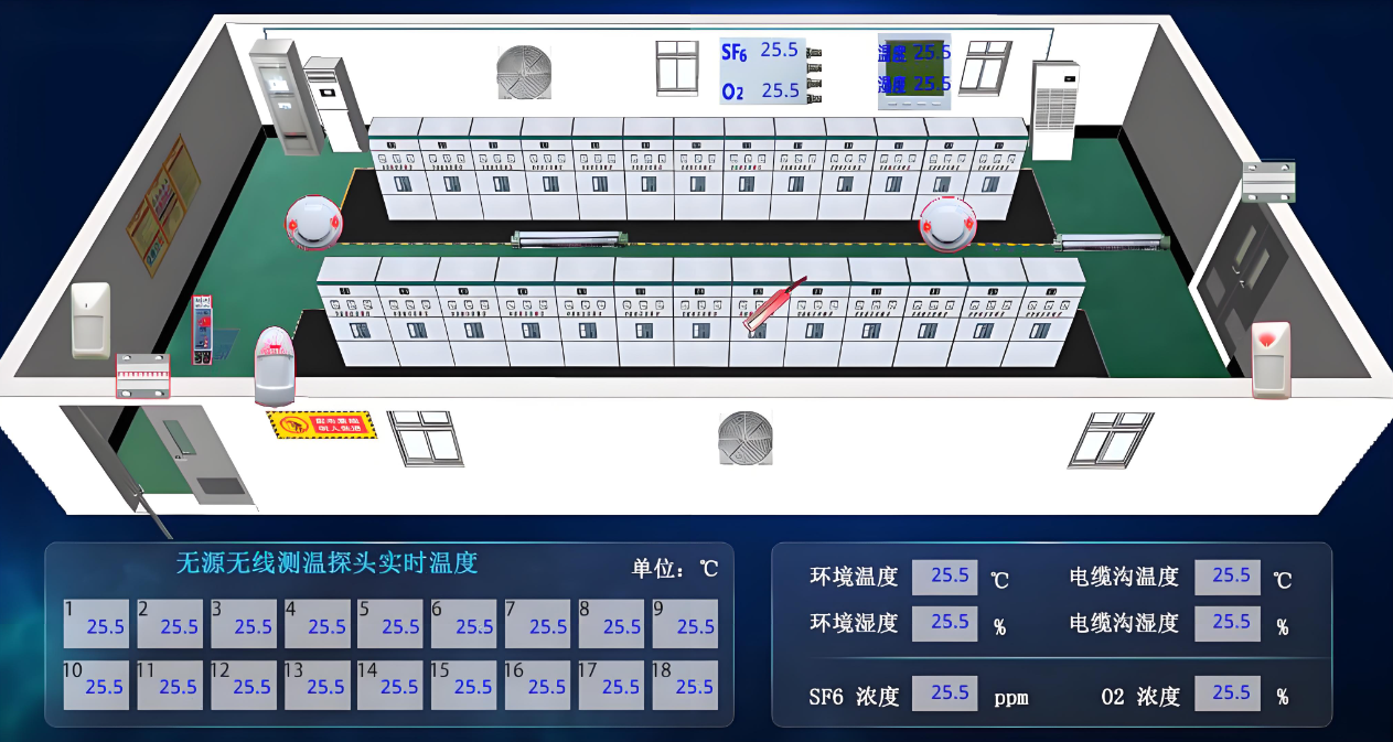 對(duì)變壓器、高壓柜、電纜和低壓柜的溫度、局放等設(shè)備狀態(tài)信息采集,并結(jié)合擴(kuò)展設(shè)備實(shí)現(xiàn)電氣設(shè)備預(yù)警聯(lián)動(dòng),對(duì)配電房設(shè)備實(shí)時(shí)在線監(jiān)控。