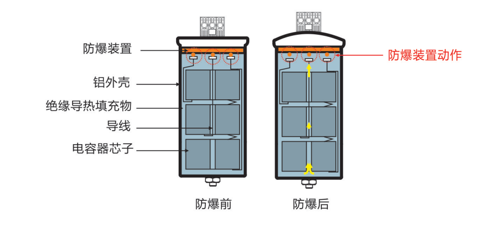 ● 防爆裝置;當(dāng)電容器內(nèi)部發(fā)生故障,溫度持續(xù)升高導(dǎo)致聚丙烯膜自愈能力下降或者損壞,產(chǎn)生氣體壓力,過(guò)壓保護(hù)裝置會(huì)在壓力作用下變形升高,進(jìn)行防爆泄壓。