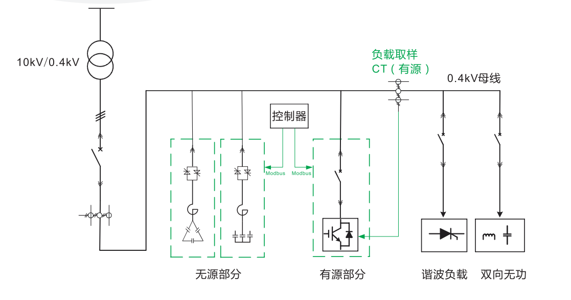 一機(jī)多能:具備多種功能,濾波治理、無功功率補(bǔ)償、三相不平衡調(diào)節(jié)、通過高精度治理極大提高功率因數(shù)、補(bǔ)償精度、諧波濾除率等電能質(zhì)量指標(biāo)。