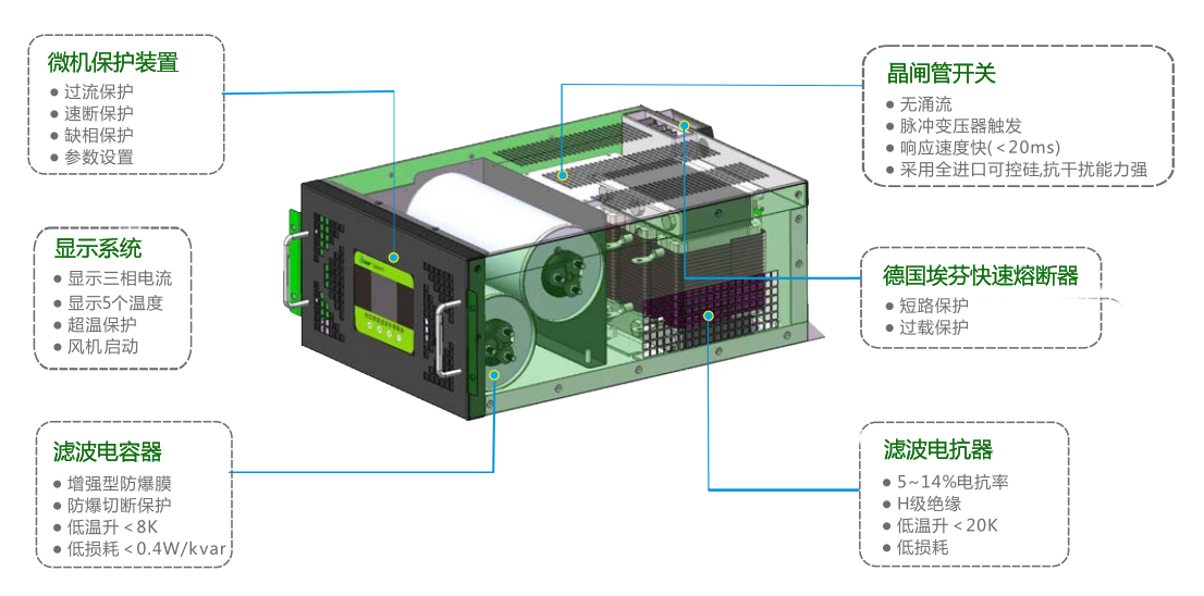 安全可靠:匹配高性能電力電容器和串聯(lián)電抗器,體積小、重量輕、高品質(zhì)、低溫升、低功耗、壽命長(zhǎng),從而保證了整機(jī)的安全性和可靠性。