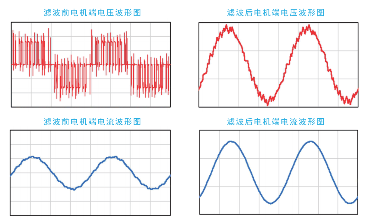 降低變頻器輸出PWM脈沖電壓沖擊,減少電機端發(fā)生行波反射現(xiàn)象,防止電機絕緣擊穿,造成電纜爆裂,減少高頻集膚效應,減少電纜的線損和電機的銅損,減少高頻渦流效應,降低電機鐵芯的鐵損,降低電機發(fā)熱與絕緣老化,較少對電機軸承造成損傷。