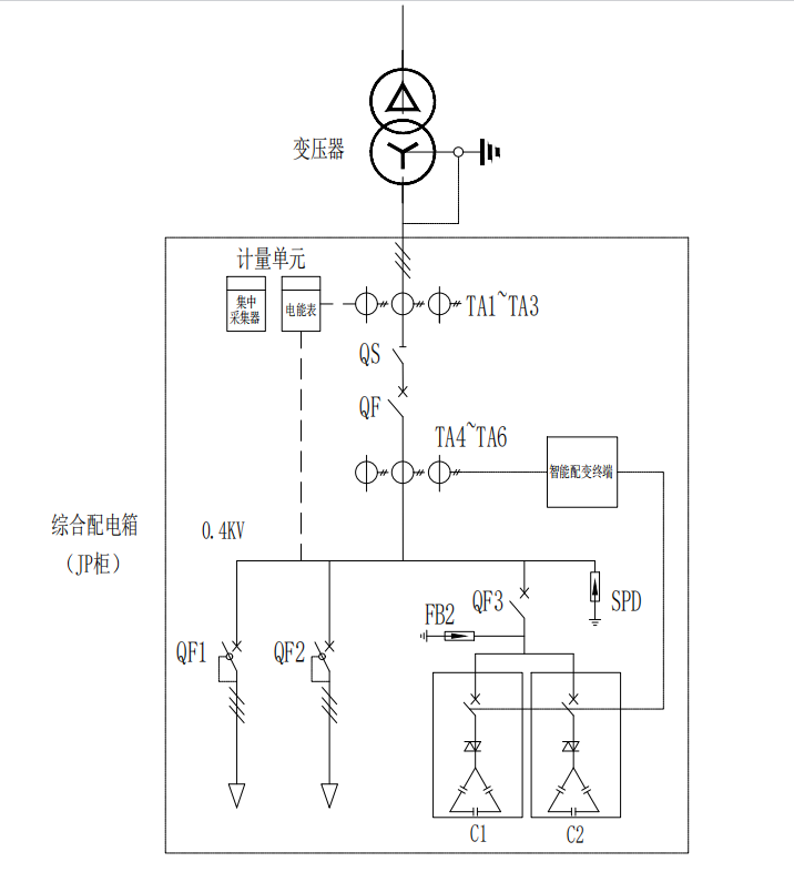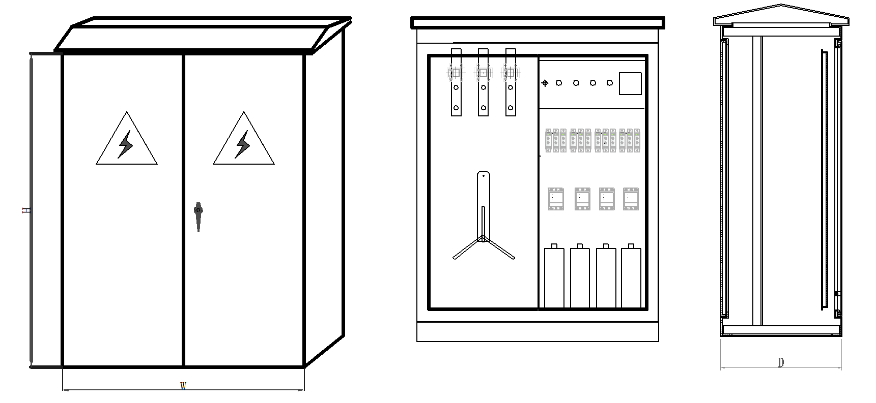 電能分配:內(nèi)部安裝進(jìn)線刀熔開關(guān),出線斷路器,進(jìn)線刀熔開關(guān)容量與出線斷路器容量及路數(shù)滿足配變?nèi)萘亢凸╇娨螅?